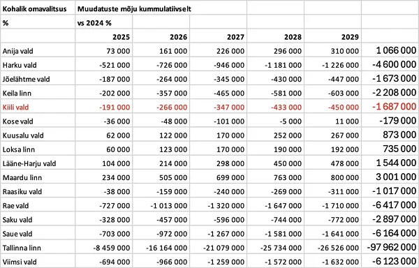 Kui palju kaotab Kiili vald oma tulust nn Robin Hoodi projekti ehk ümberjagamise tõttu?